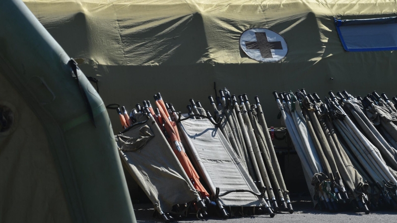 Носилки у одной из палаток полевой медико-санитарной части. Архивное фото